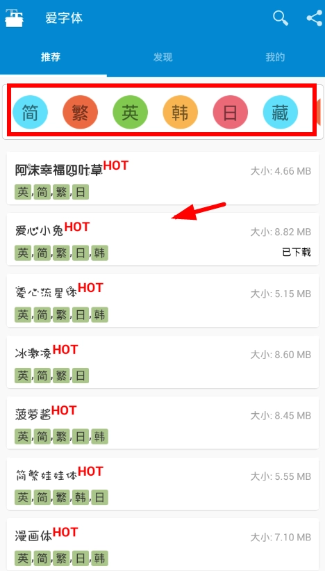 1、在爱字体里,你既可以用搜索功能找到喜欢的字体,也能在顶部切换语言分类,这样能更高效地找到想要的字体类型。