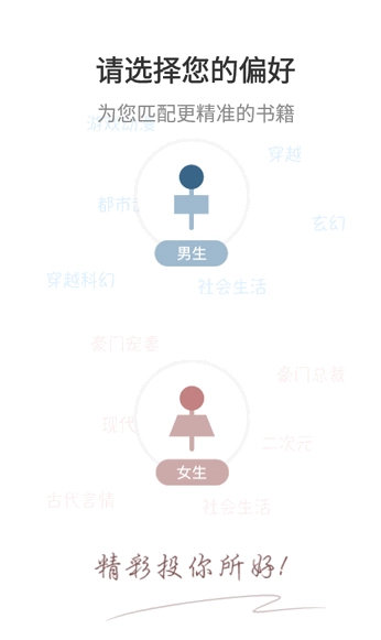 1、完成后打开软件,设置个人阅读偏好,系统会更精准地为你推荐书籍。