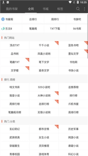 1、在本站悦读小说App中进入首页后,能看到有不少小说网站可供选择进入;