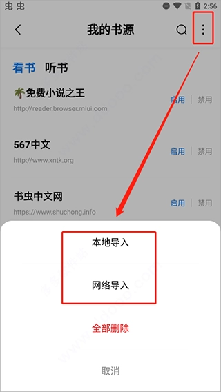 3、要是觉得书源数量不足,也可以点击右上角自行导入书源,这里支持本地导入和网络导入两种方式。