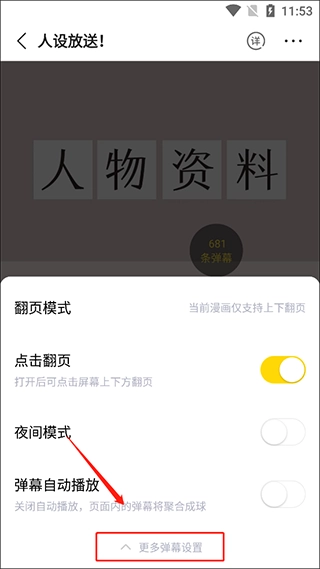 5、进入弹幕设置界面后,找到“自动播放”选项,点击其右侧的开关将其开启,这样就能让漫画弹幕自动播放了。
