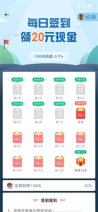 2、设有每日签到任务,完成后可获得相应的现金奖励,连续签到天数越多奖励越丰厚,每次累计签到满15天还能额外获得2-5元现金。