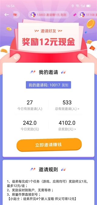 4、邀请他人参与试玩,可获得最高12元/位的现金奖励;朋友每完成一次每日任务,邀请人就能得到1元,该奖励累计上限为12元。