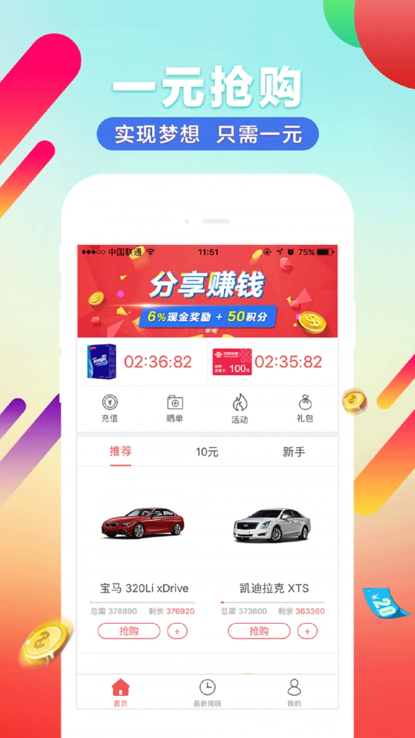 3)平台采用“1元抢购”作为核心玩法,用户只需支付1元,就有机会赢取价值超万元的商品。