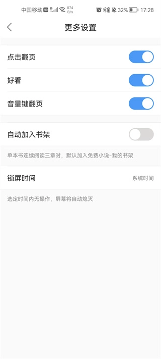 4、进入该设置页面后,即可自由进行相关设置,比如开启或关闭音量键翻页功能,以及点击翻页功能等。