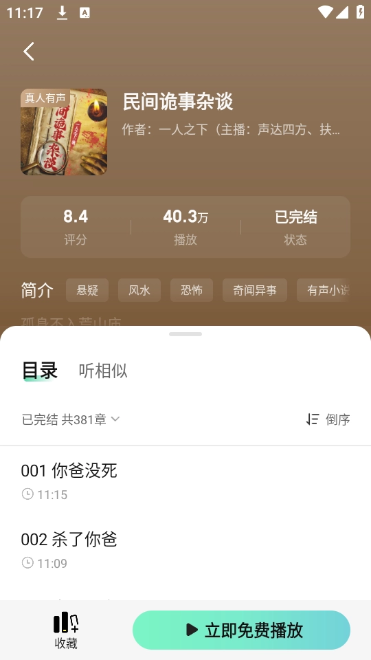 3、点击任意小说封面,就能进入详情页查看简介、目录和评分信息,点击播放按钮就能在线收听或离线缓存收听;