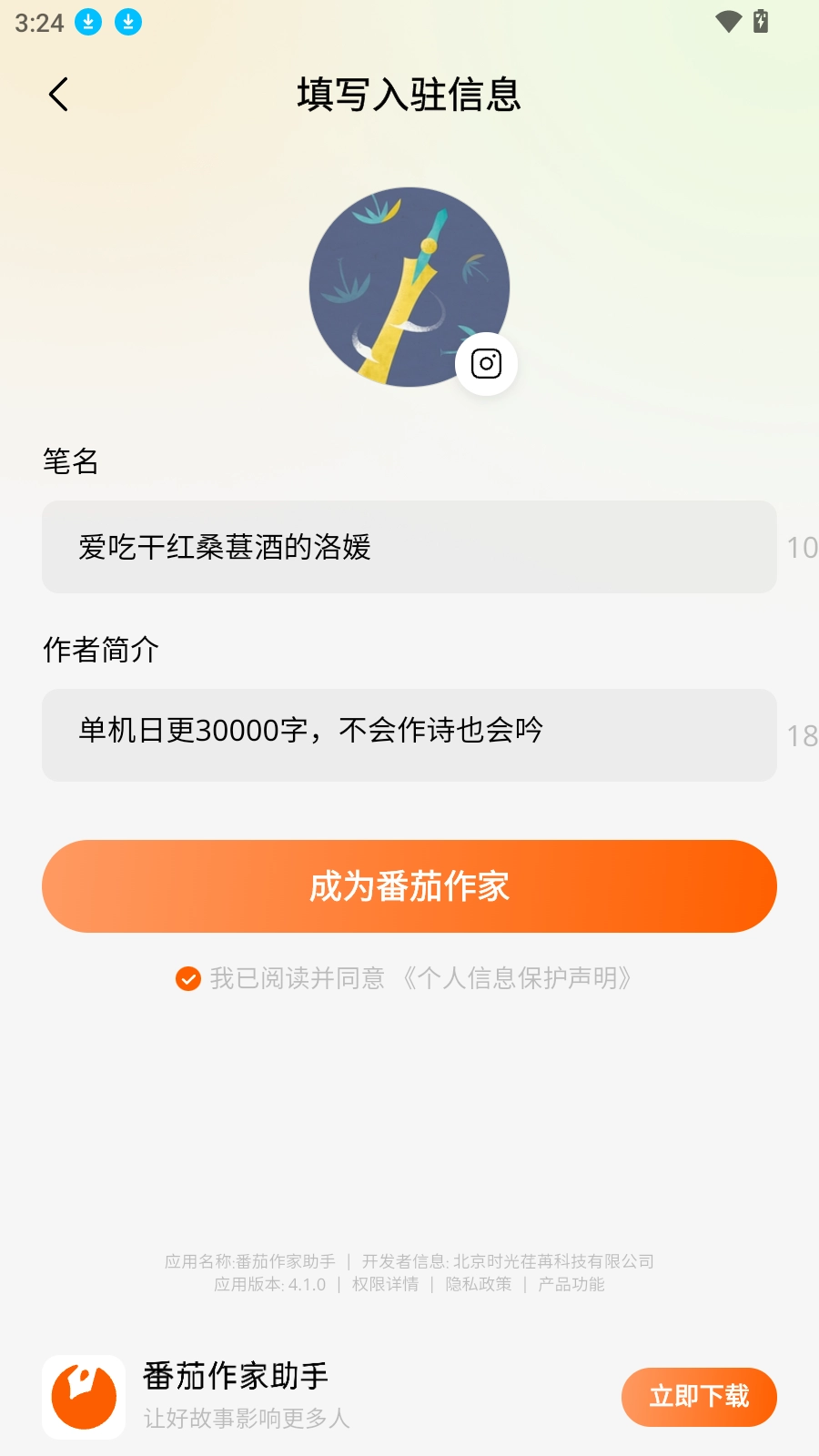 3.完成入驻信息的填写点击成为番茄作家