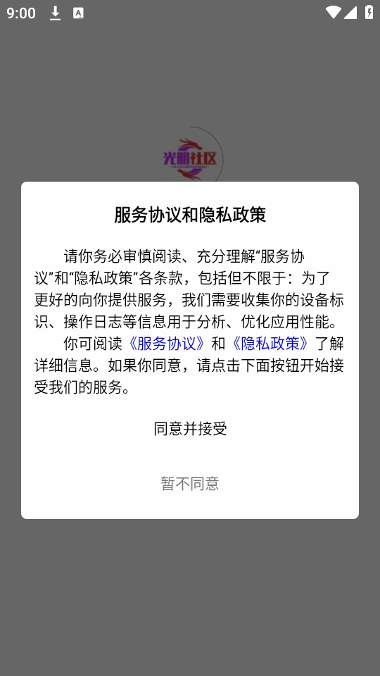 1、首先,请通过正规渠道获取光明社区应用程序,完成获取后打开应用的主界面。