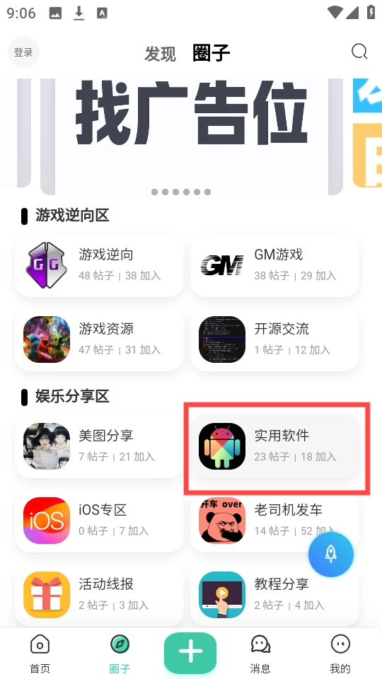 3、进入圈子页面后,找到“实用软件”板块并点击,即可浏览其中的精选应用推荐。