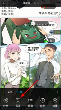 进入漫画阅读界面后,轻点屏幕中央就能唤出工具栏,此时在下方找到【书签】选项并点击,即可保存当前的阅读进度。