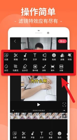3、剪辑页面配备了丰富的编辑按钮,支持添加滤镜、特效、文字、水印、马赛克等实用的编辑功能。