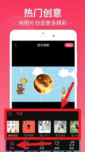4、进入“音乐相册”创作区域,挑选成长日记、爱心卡片等预设模板,就能快速打造专属的相册视频。