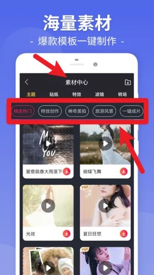 2、在“素材中心”里挑选热门模板,这些模板包含神奇美拍、特效创作等多种风格,还支持一键成片的功能。
