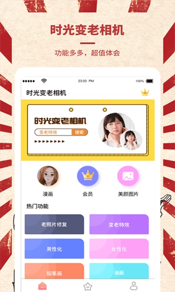 时光变老相机配备了丰富多样的老化特效与滤镜,用户能够依据自身需求,对皱纹的深浅程度、白发的多少等细节进行调整,从而感受不同的衰老效果。此外,相机还提供多种漫画风格的头像模板,能把照片转化为漫画人物形象,增添更多的趣味性。