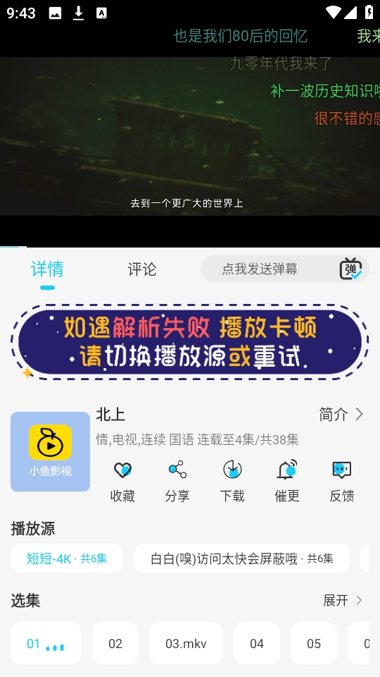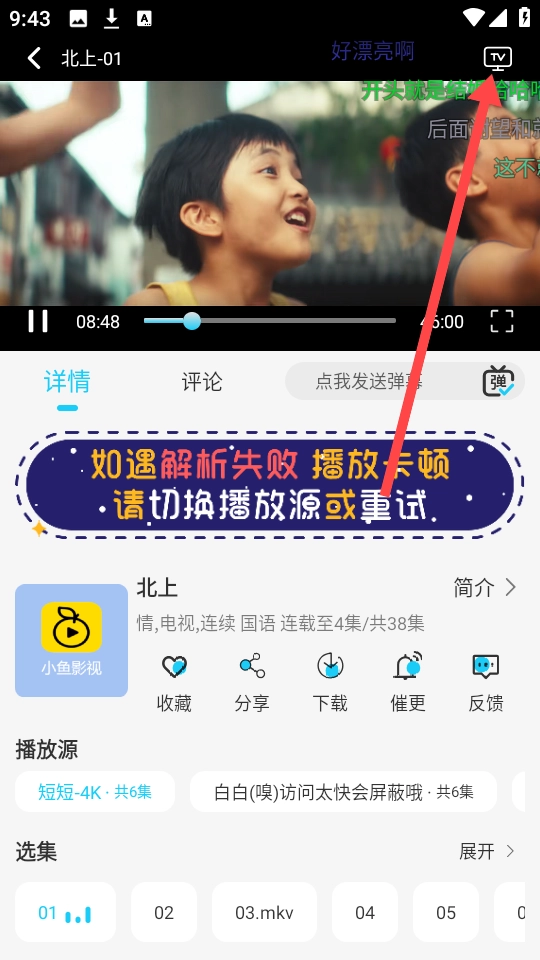 1、打开小鱼影视,挑选一部想要观看的影视剧并开始播放,这里以《北上》为例来演示操作步骤。