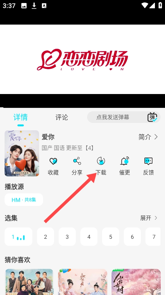 1、打开火花剧场,挑选一部电视剧并开始播放,在播放界面找到“”按钮。