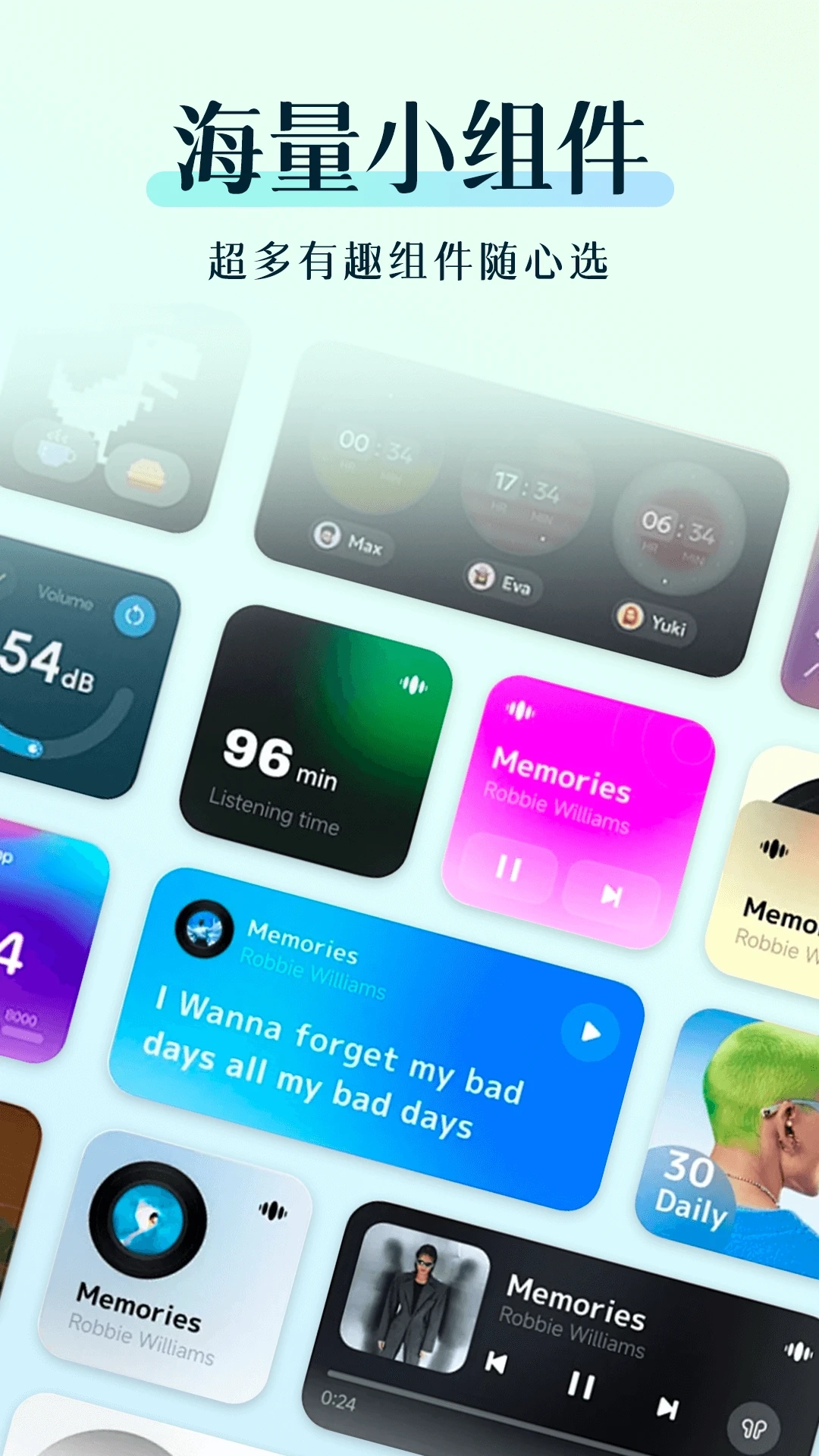 3、支持添加音乐控制面板、炫彩时钟、倒计时提醒等实用组件,既注重美观呈现,又能实现高效操作。