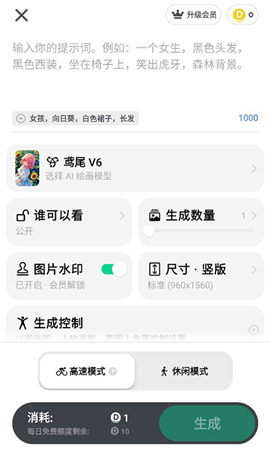 4、接下来用户需要通过打字来描述想要绘制的人物形象,像头发、脸型、嘴型、眼睛这类细节都可以描述清楚,输入完成后点击下方的生成按钮就可以了!