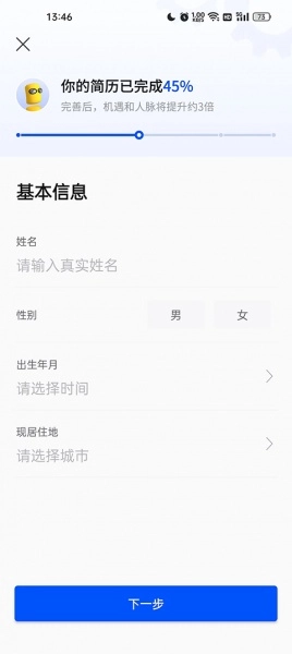 5、点击“下一步”后会进入基本信息填写页面,依次填写姓名、性别、出生年月、居住地等信息,再次点击“下一步”,继续完成后续个人信息的填写,最后点击“确定”,即可完成简历的完善。