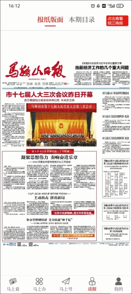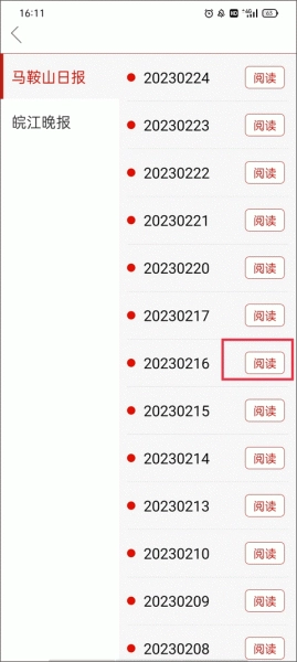 1、切换至软件的【读报】界面,你能在线阅读马鞍山日报,要是想切换其他时间段的报纸内容,可点击上方的“点击查看皖江晚报”;