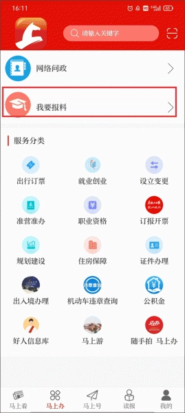 1、点击下方菜单栏的【马上办】选项,该板块包含丰富的服务项目,接着点击页面上方的“我要报料”按钮。