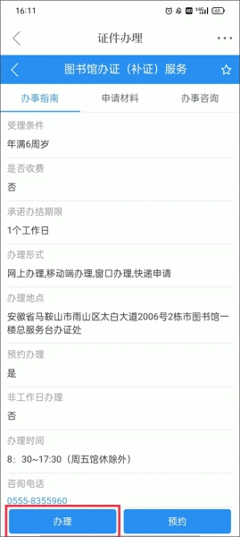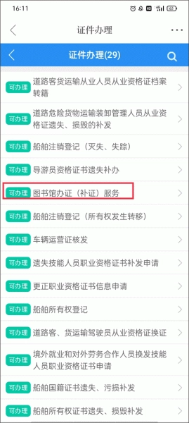2、这里总共有29种业务服务可供办理,请选择“图书馆办证(补证)服务”。