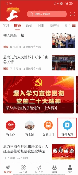 1、进入【马上看】板块,选择“证件办理”业务服务;