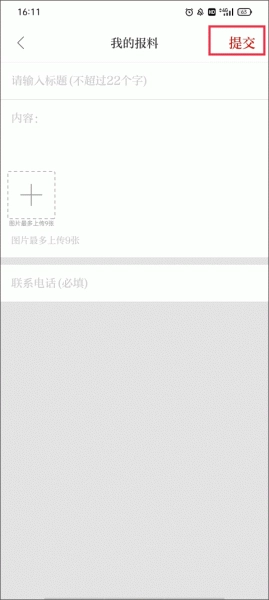 2、填写标题和报料的具体内容,上传对应的照片,填写你的联系方式,最后点击右上角的提交按钮即可。