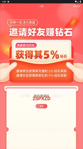 2、每邀请一位男生,就能获得该男生充值金额5%的钻石奖励;每邀请一位女生,则能获得该女生收礼金额5%的钻石奖励。
