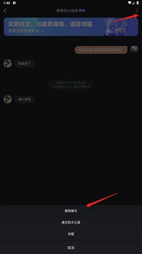 2、点击右上角的“更多”按钮,接着选择“解除聊天”选项就可以了。