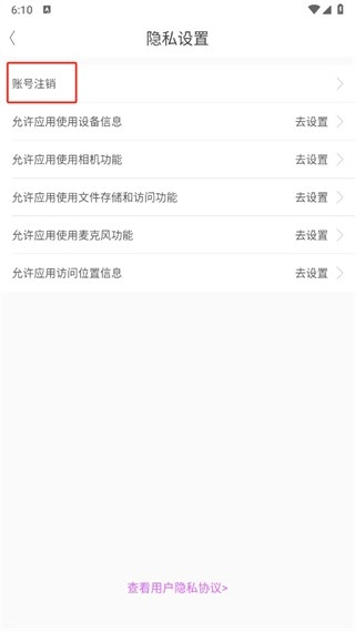 4、接着进入隐私设置页面,在该页面中点击【账号注销】选项。