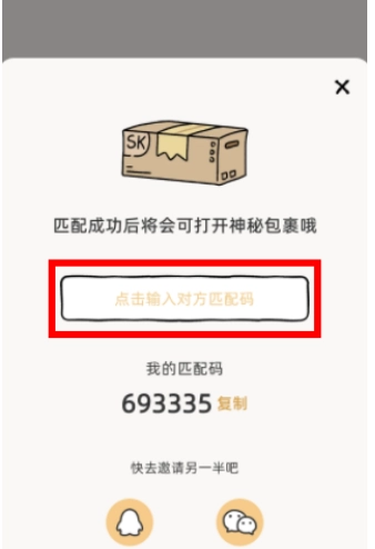 3、同样,你也可以把自己的匹配码复制下来发给对方,让对方来完成匹配操作,另外还能通过QQ和微信渠道邀请另一半。