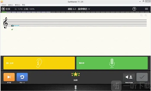 1、点击“新示例”后,会播放一个单音,你需要用麦克风模仿这个听到的音进行演唱。完成模仿后,界面上方的五线谱里会显示出你所唱的音符(如下图所示)。点击界面右下角的“演奏您的答案”按钮,就能听到自己演唱的内容是否准确。