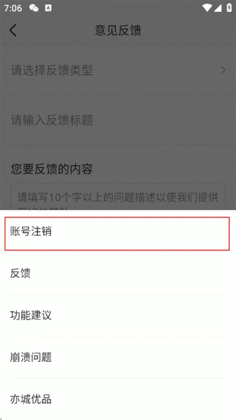 3、选择反馈类型为账号注销;