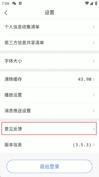 2、找到并点击意见反馈;