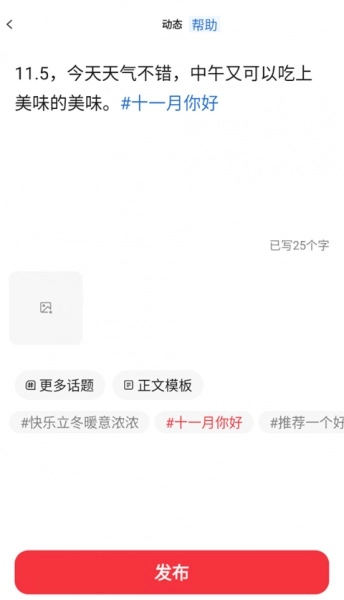 3、我们以动态为例,输入你想发布的动态内容,可附带图片和话题,点击发布后就能在社区动态中发布出去。