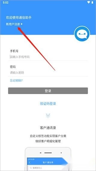 1、打开通信助手软件,点击左上角“新用户注册”;