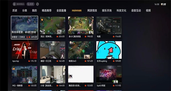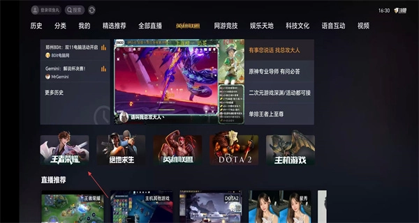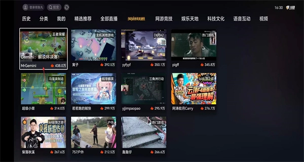 1、启动软件进入主界面后,能看到多个分类选项,挑选自己感兴趣的分类,即可查看该分类下对应的直播推荐内容。