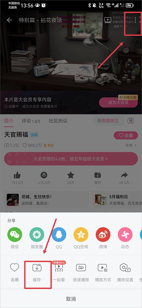 2、在动画观看界面点击右上角的三点图标,接着点击下方的缓存按钮。