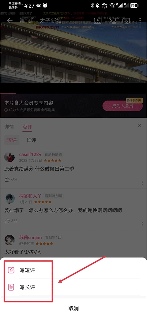 4、点击后选择写短评或长评,就能为喜欢的动画评分了。