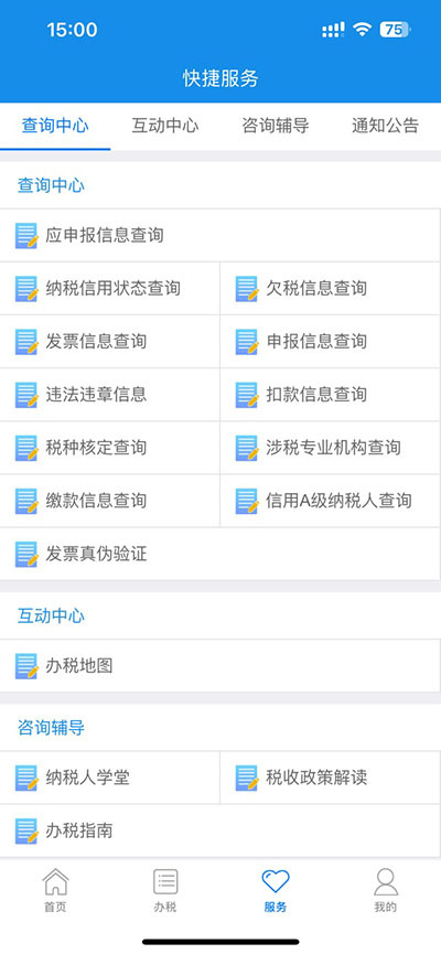 1、打开移动办税APP,进入【服务】页面后,滑动屏幕找到“查询中心”板块;