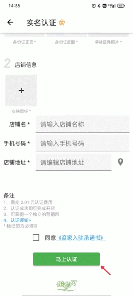 3、填写身份证与店铺相关信息,勾选同意《商家入驻承诺书》,随后点击“马上认证”,待系统审核通过后,就能获得卖家身份。
