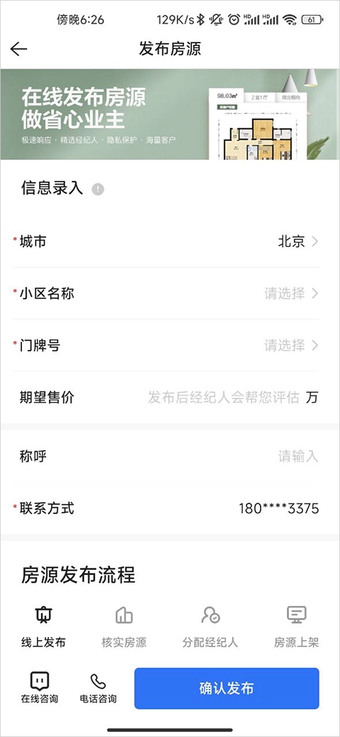 接下来,在“发布房源”的信息栏里,填写城市、小区名称,精确到门牌号,接着设定期望售价,填写自己的联系方式,方便房产中介经纪人能及时与您取得联系。最后把信息编辑好,点击下方的确认发布按钮,就能完成操作了。