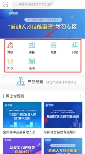 2、打开进入后,首页提供了党校、课程、专题等多种功能模块。