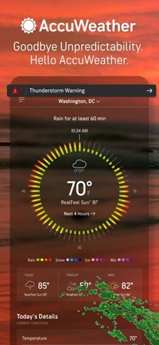 AccuWeather是一款生活中不可或缺的实用天气预报工具软件,这款软件具备强大的天气信息预报功能,覆盖全球各地的天气情况,能让用户快速查看当前城市及其他城市的实时天气状况,还可以了解降雨、温度、湿度等详细天气信息,而且软件内没有任何弹窗广告,有需要的用户可以在本站使用。