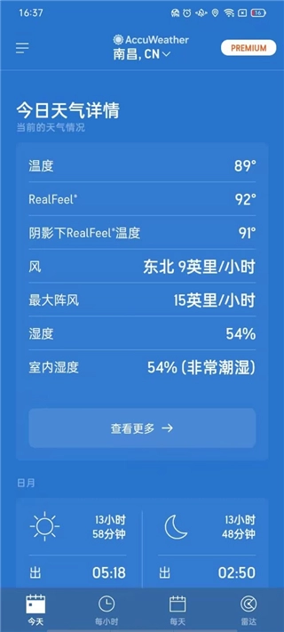 3、湿度百分比每15分钟更新一次,同时还支持显示能见度、紫外线指数、风速风向以及日出日落时间。