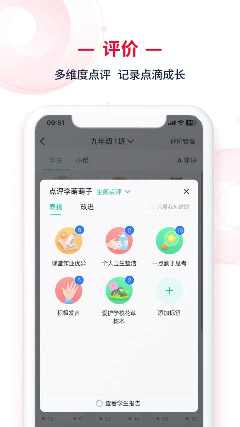 3、能依据学生的课堂表现添加个性化标签,为学生一对一量身定制鼓励性评价,并且可以实时查看学生的成长记录,以此实现精准化的教学引导。