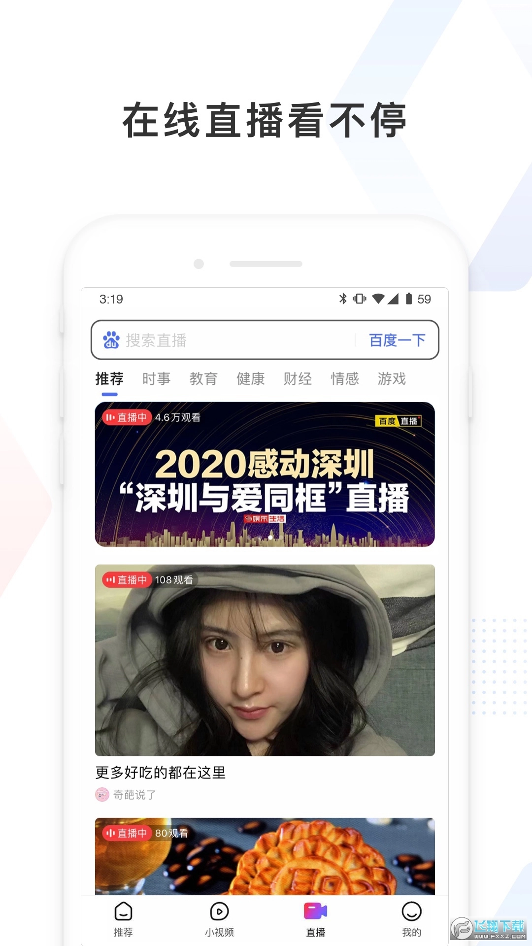 在小视频页面,展示的是短视频内容,上下滑动就能刷新出新的短视频内容。在“百度看看”直播页面,用户可以观看正在进行的直播内容以及直播回看内容,直播分类包含“推荐”“时事”“教育”“健康”“财经”“情感”等,内容主要来源于好看视频和贴吧的直播。