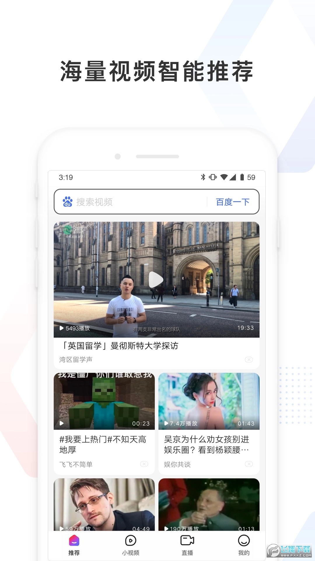 推荐页的上方设有“百度一下”搜索框。而在百度看看里,这里的“百度一下”和大家平时用的不一样——它专门针对视频内容进行搜索,不会显示图文等其他类型的信息,搜索类别也只有“视频”“小视频”“直播”这几种,搜索结果则以智能化的Feed流形式呈现。