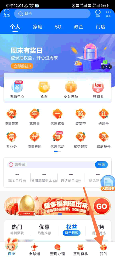 首先我们进入重庆移动,能看到首页有各种各样的功能,这时候点击底部的“我的”,就能进入个人界面了。